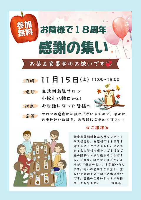 生活刺激隊ホーム 生活刺激隊とは、マンネリ化した日常生活に心地好い刺激をお届けすることを目的としたコミュニティです。各専門分野がそれぞれの分野で社会を変えていく役割を担います。参加している人たちに「活動」「学び」「出会い」を通して、お互い様の精神と新たな自分発見&挑戦の機会を提供しています。各分野の先駆的な取り組みや一人ひとりのエネルギーがみんなの大きなモティベーションとなっています。素敵な仲間づくりに、皆様のご参加をお待ちしています。